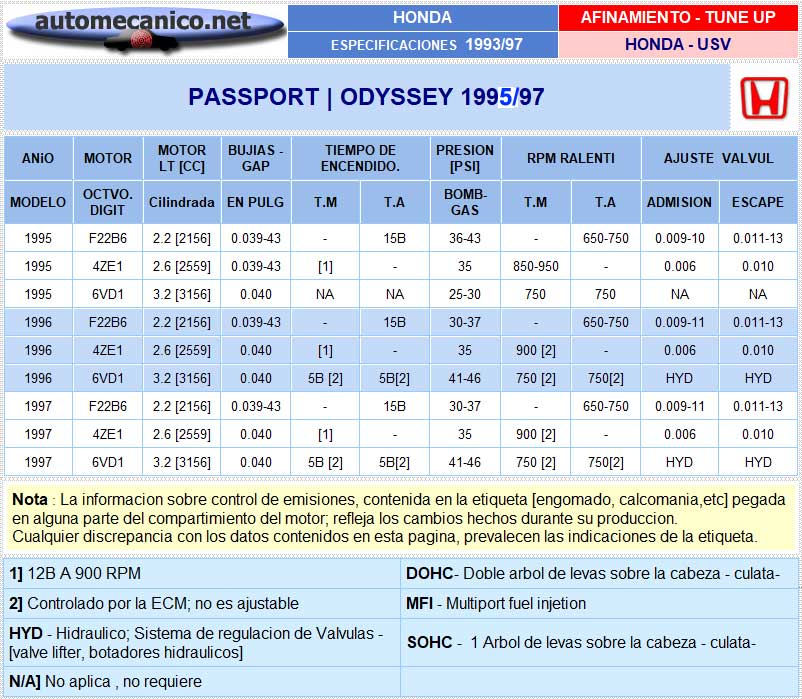 | HONDA / USV - Espec. Afinamiento - Tune-up Passport, Odyssey - 1995/97 |